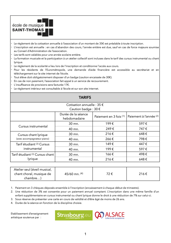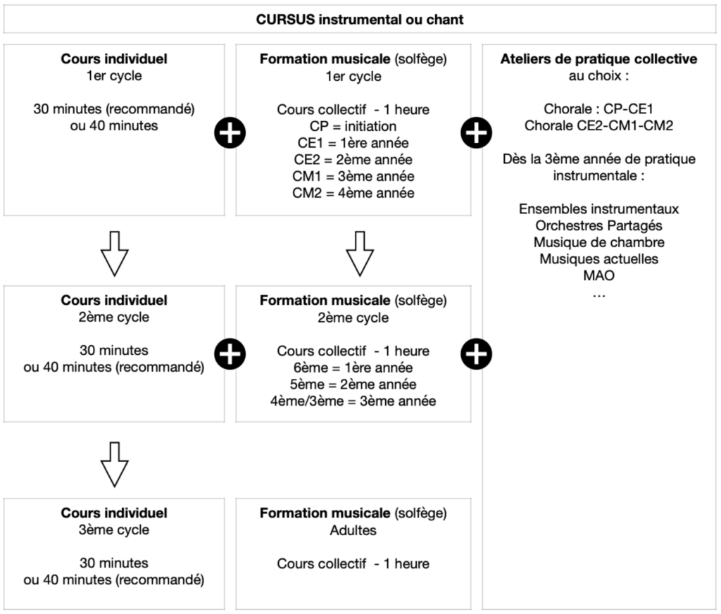 – ou s’inscrire au cursus qui comprend à la fois le cours individuel d’instrument (ou de chant), le cours de formation musicale et un atelier collectif.